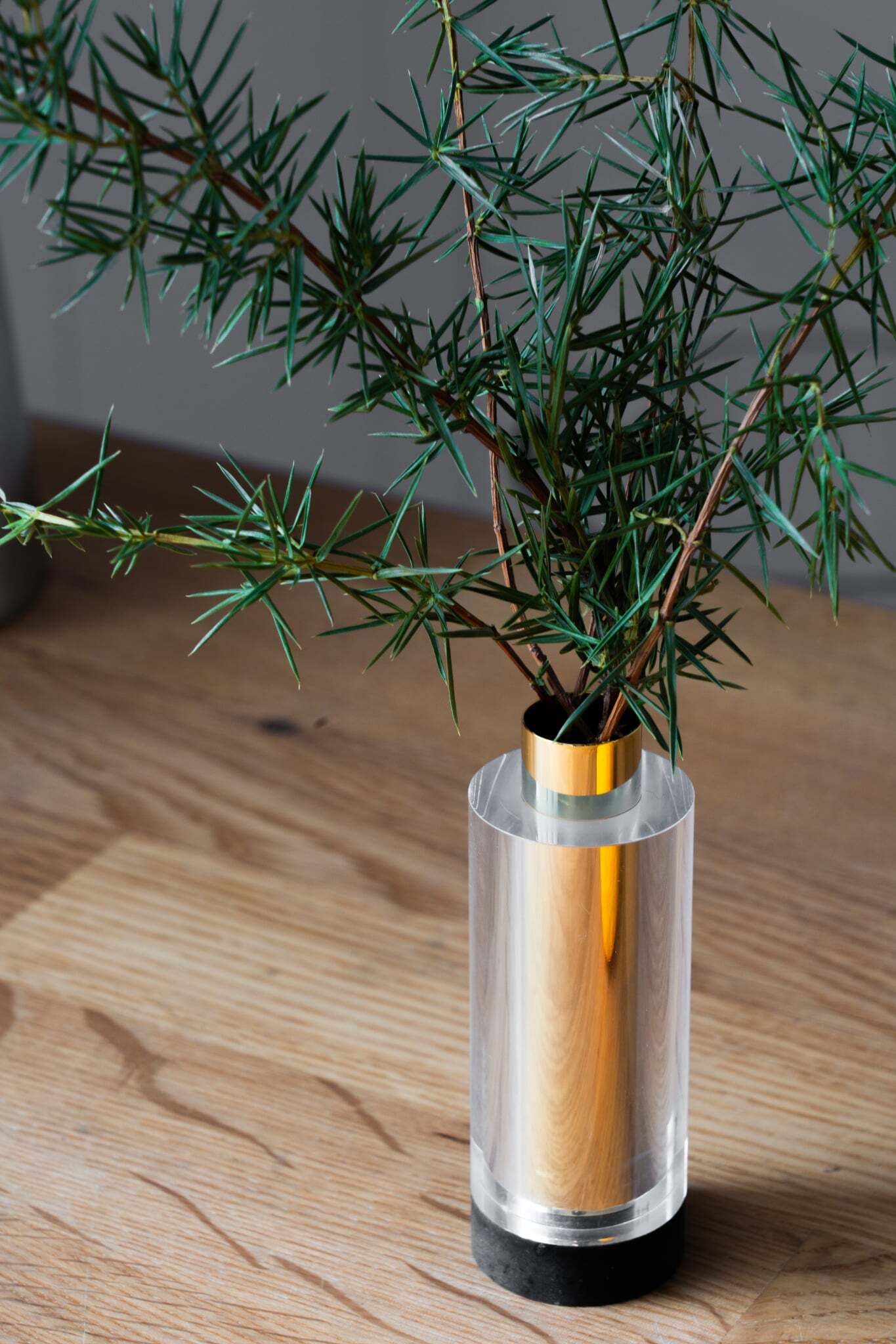 端正な構造が、草木をすっと受け止める。 「Solo」は草木を端正に支える削ぎ落されたフォルムを持つ花器です。 透明なアクリルの筒、中心に立つ真鍮の筒、そして人工大理石の台座が、それぞれの質感を際立たせながら縦のフォルムを描きます。 人工大理石の土台に真鍮の筒がすっと伸び、アクリルが柔らかい輪郭を描きながら全体を引き締めます。 「Solo」は素材のコントラストと高さのある佇まいで、草木を引き立てる静謐な品格を空間にもたらします。 サイズ 30×30×82㎜ 素材 アクリル、人工大理石、真鍮